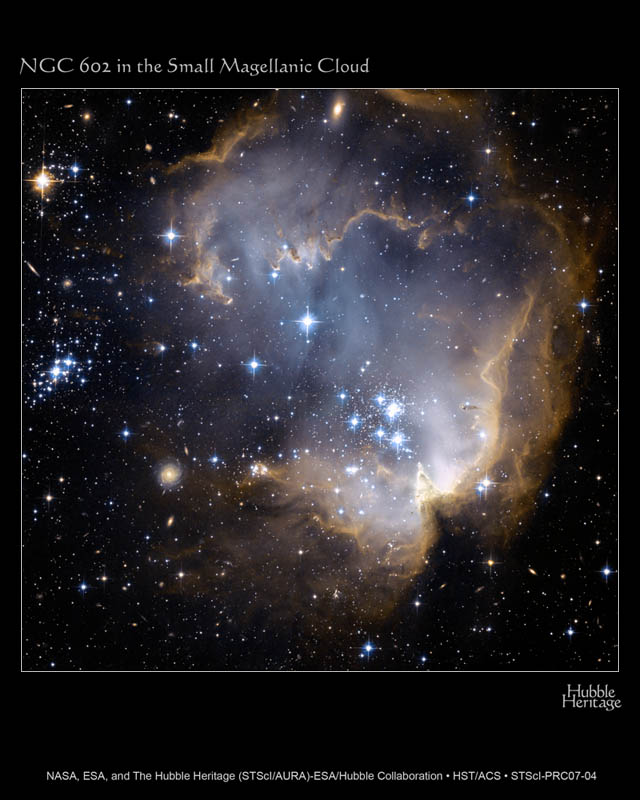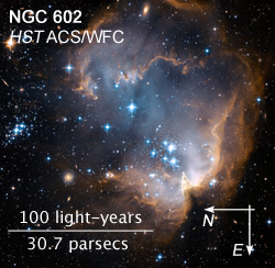 At the heart of the star-forming region, lies star cluster NGC 602. The high-energy radiation blazing out from the hot young stars is sculpting the inner edge of the outer portions of the nebula, slowly eroding it away and eating into the material beyond. The diffuse outer reaches of the nebula prevent the energetic outflows from streaming away from the cluster.